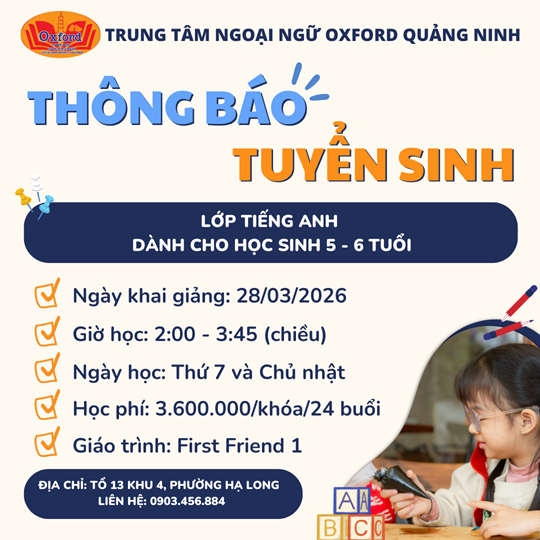 Trung tâm Ngoại ngữ Oxford Quảng Ninh thông báo khai giảng lớp Tiếng Anh Mầm non dành cho học sinh 5–6 tuổi.